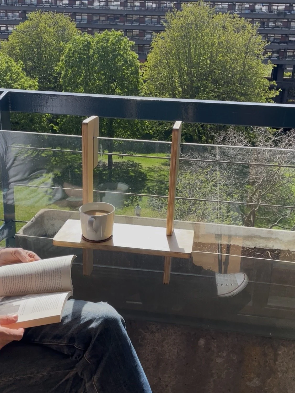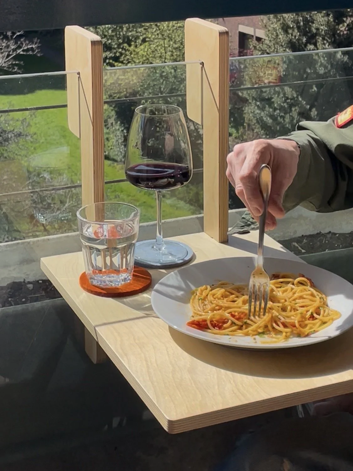 Like other balcony-specific tables, the supports hang of the glass balustrade. The supports and tabletops slot together and friction keeps them in place. Because there are no legs, there’s plenty of space for your own.