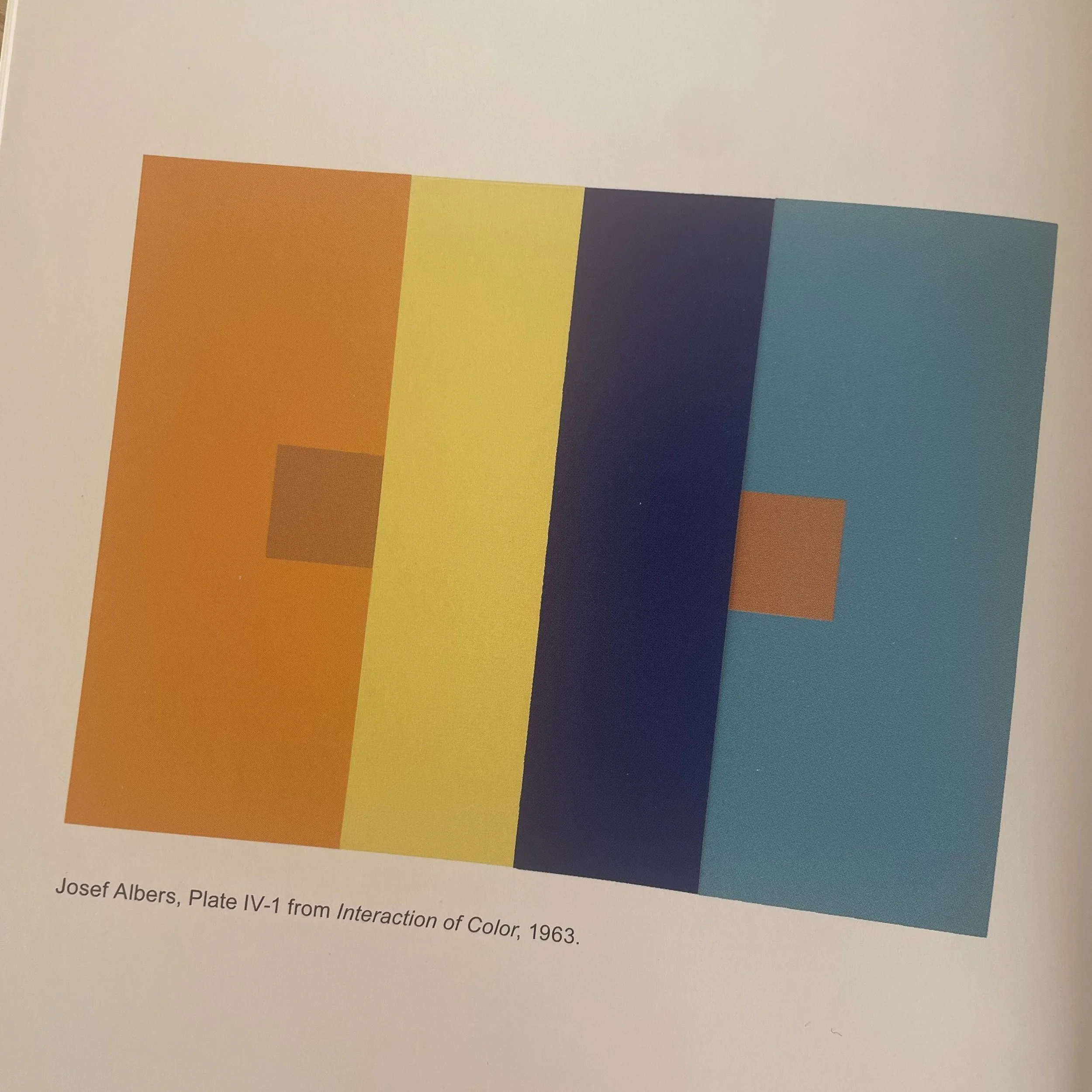 In 1963, he published Interaction of Color, a set of twenty exercises for students and educators based on his teaching practice. At the heart of these experiments was the idea that colour is, in a sense, an illusion; that our perception of a colour is relative and changes depending context in which we experience it. In the picture below, the two small brown squares are the same colour but appear different relative to the blue and yellow.